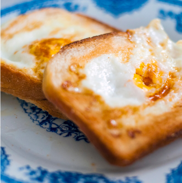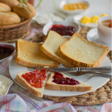 Café o té, tostadas con mantequilla y mermelada, y zumo natural.